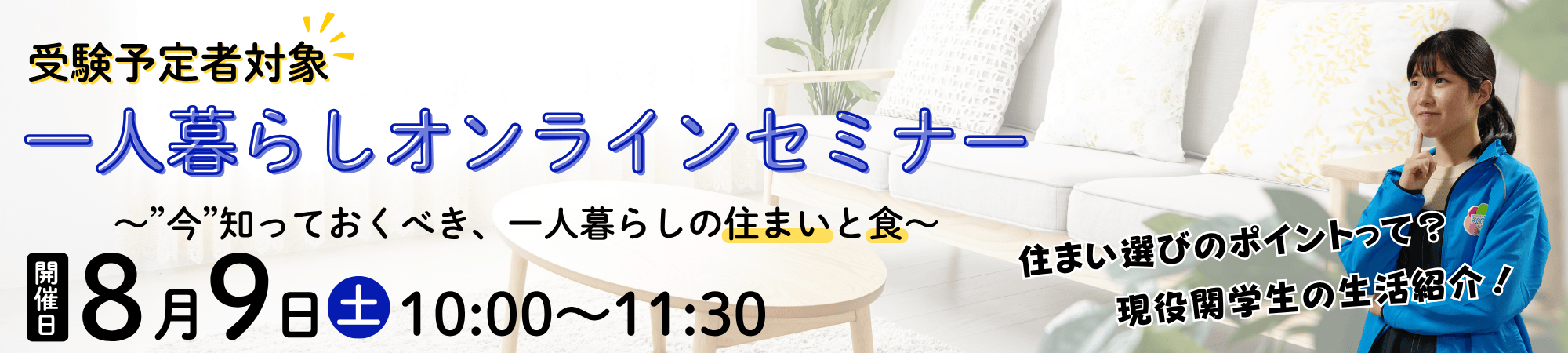 2025.09.01(月) お知らせ住まい(西宮上ケ原キャンパス) 一人暮らしオンラインセミナー アーカイブ公開 「“今”知っておくべき一人暮らしの住まいと食」 ー 西宮上ケ原キャンパス マイルーム店 ー