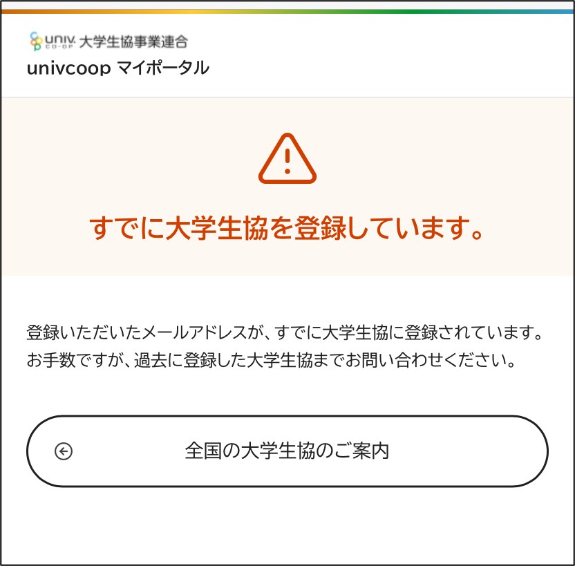 「univcoopマイポータル サインアップ完了」もしくは「すでに大学生協を登録しています。」の画面が表示されましたら、サインアップの対応は完了です。