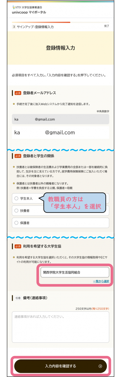 【注意】教職員の方は「登録者と学生の関係」は「学生本人」をご選択ください。