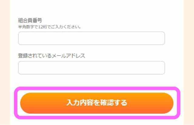 認証情報入力画面が表示されますので、「登録メールアドレス」欄にWeb組合員登録の際に入力した保護者のメールアドレスを、「組合員番号」欄にSTEP1で届いたメールに記載されているの保護者の家族組合員番号を入力し、「入力内容を確認する」をタップします。