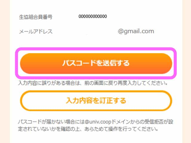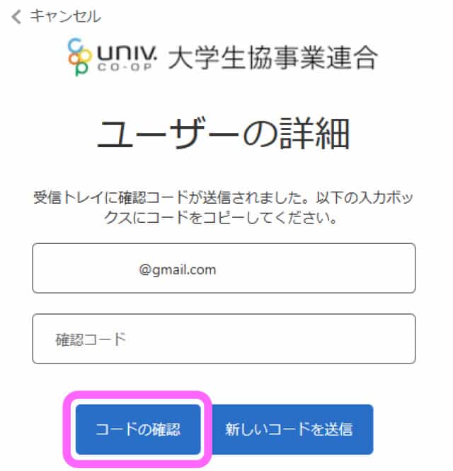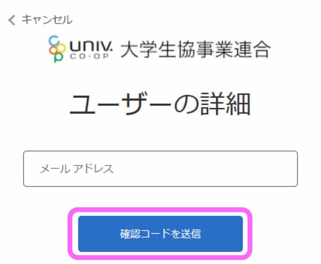 【注意】確認コードは、「 @univ.coop 」のドメインから届きます。迷惑メール設定をされている場合は、迷惑メール除外設定をお願いします。