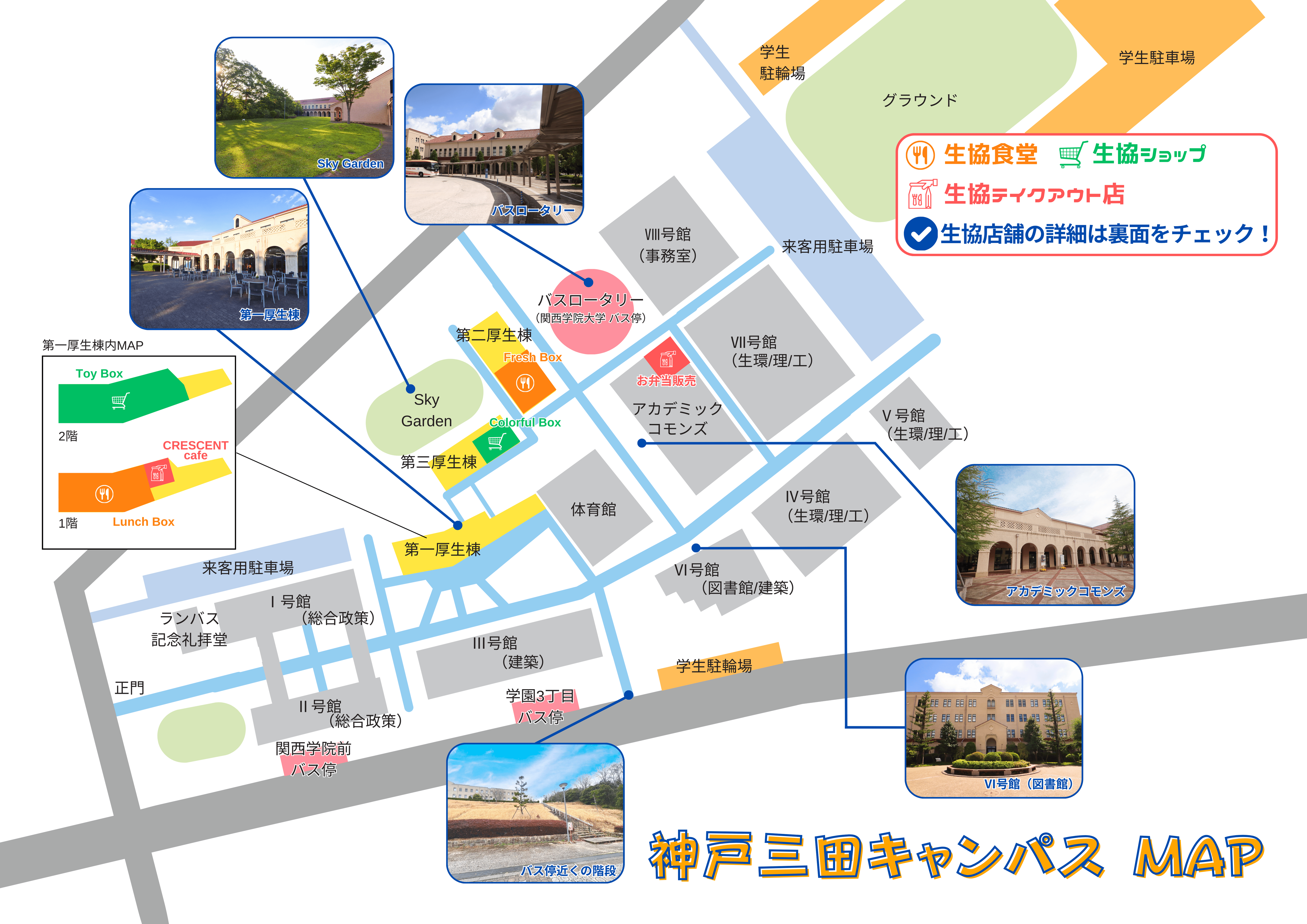 各キャンパス内の建物と生協店舗、さらに目印となるスポットの写真を掲載し、「これさえあれば迷わない、完璧なキャンパスマップ」を目指して作成しました