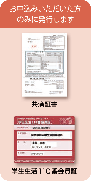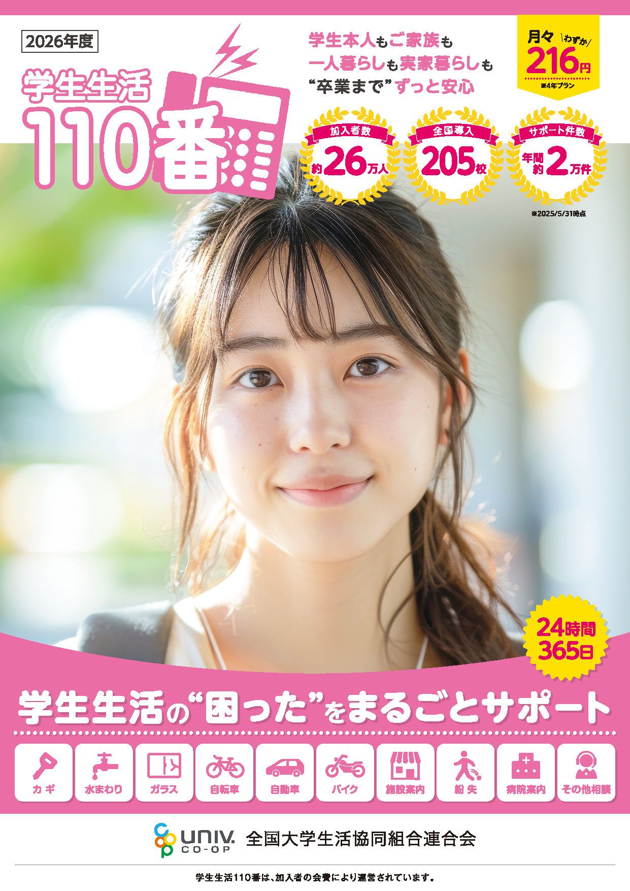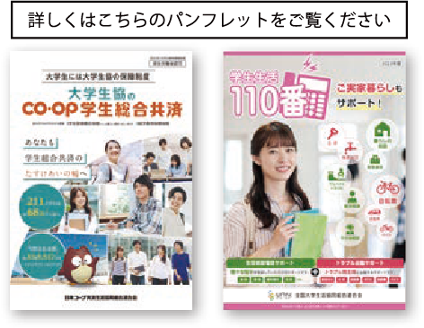 ※1)「学生生活110番」は、共済・保険とは別のサービスです。全国大学生活協同組合連合会の商品で、ジャパンベストレスキューシステム株式会社がサービスを提供しております。大学生協の組合員が加入できます。