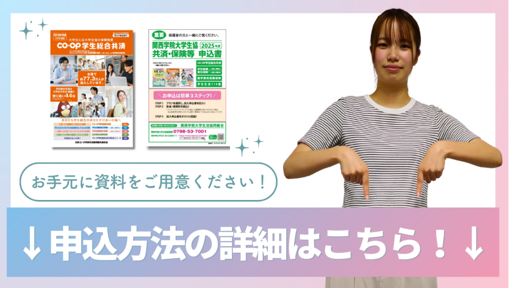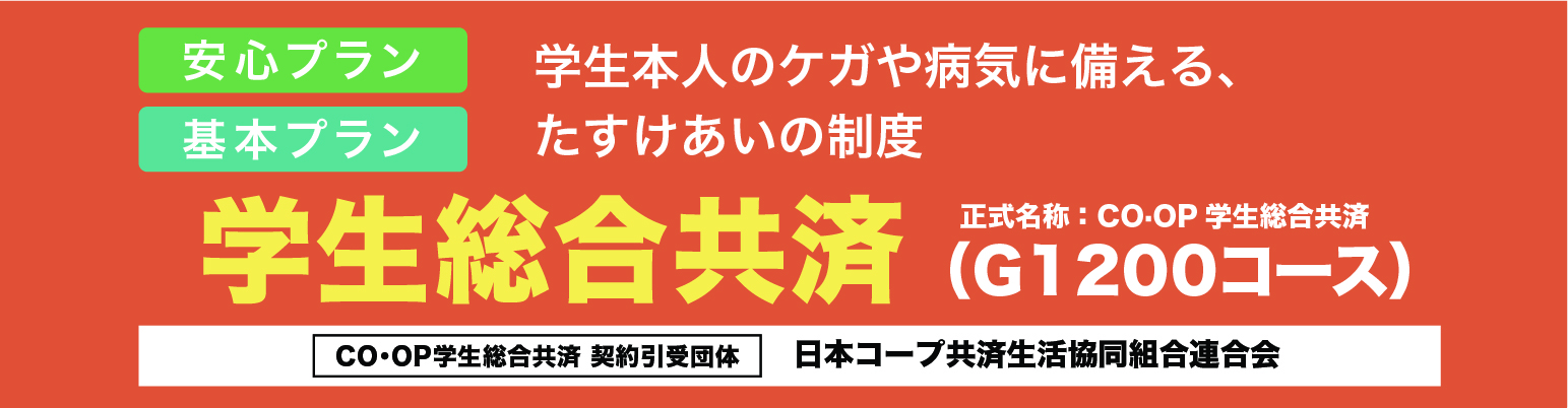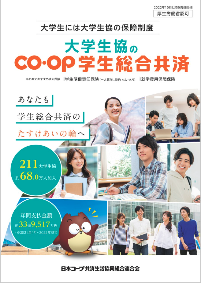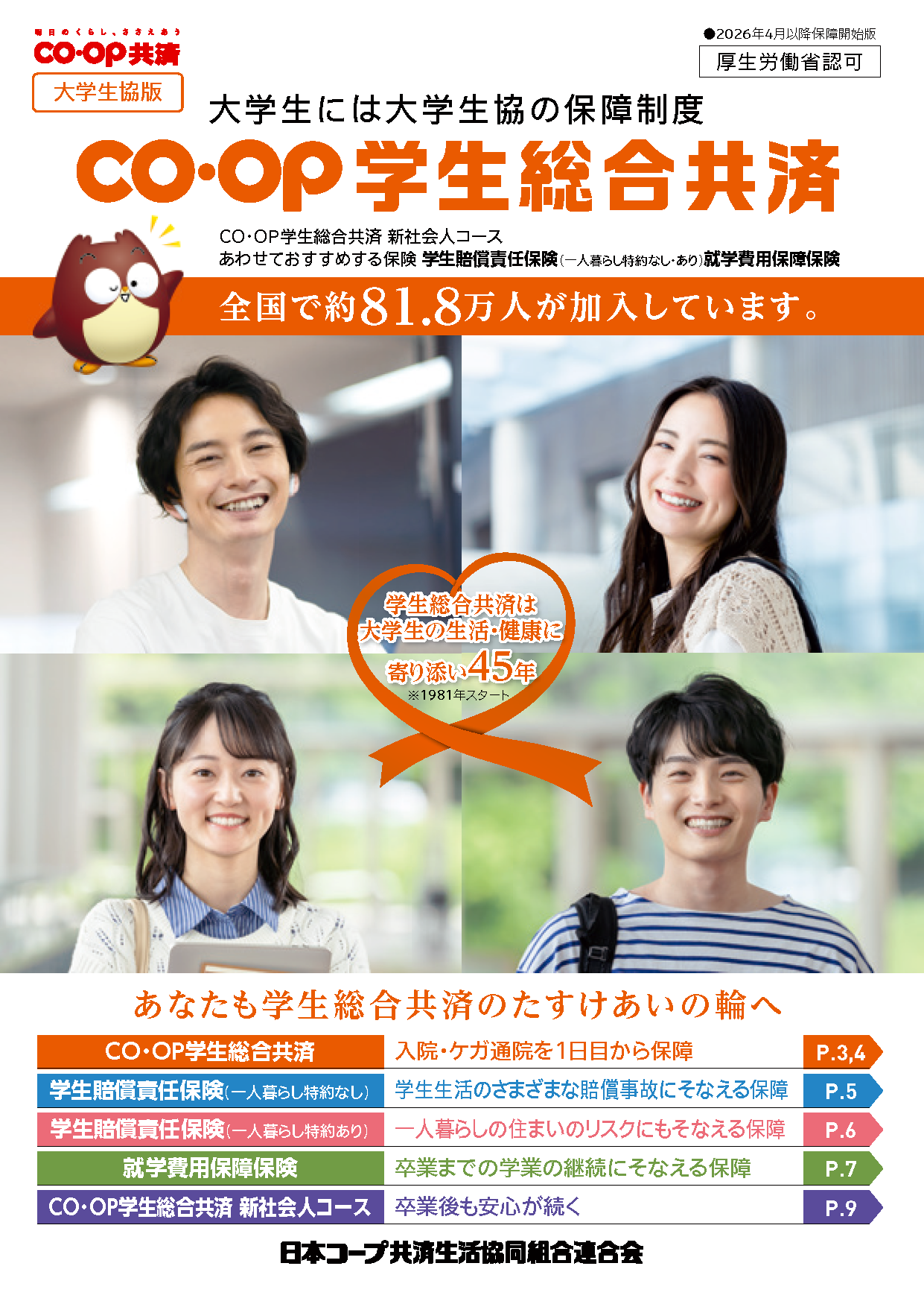 このご案内は学生賠償責任保険、就学費用保障保険の概要を説明したものです。ご加入の際は『CO・OP学生総合共済』パンフレット記載の保障内容、重要事項説明書および制度のあらましを必ずご一読ください。ご不明点があれば、パンフレット記載のお問い合わせ先までご連絡ください。