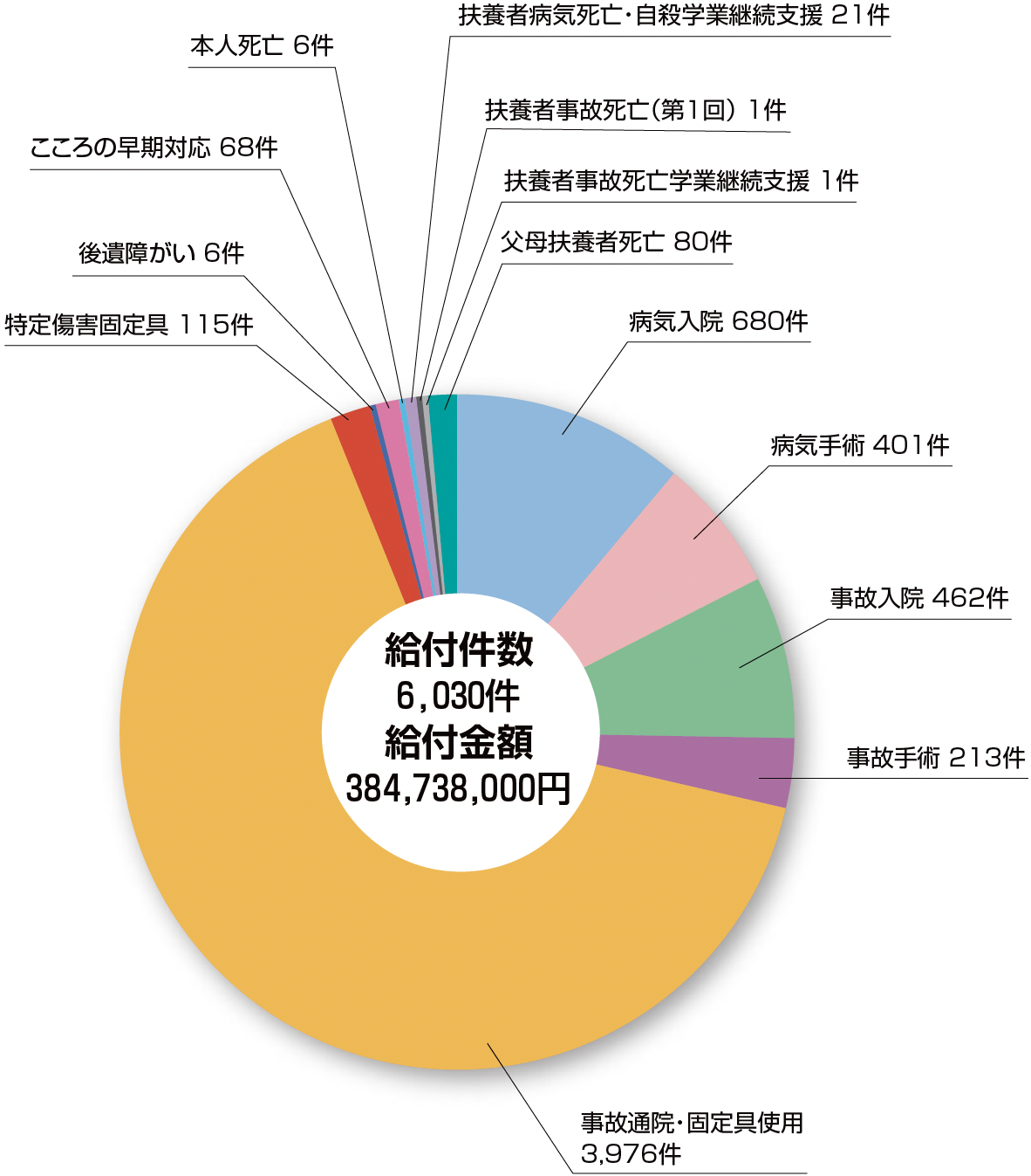 自分自身の病気やケガだけでなく、事故などで他人に迷惑をかけた場合や借用住宅の損壊や家財の損害・盗難などにもそなえられ、さらに扶養者がもしもの時の学資費用をサポートします。