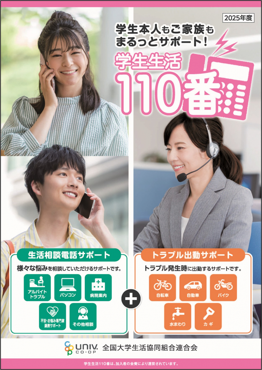このご案内は学生賠償責任保険、就学費用保障保険の概要を説明したものです。ご加入の際は『CO・OP学生総合共済』パンフレット記載の保障内容、重要事項説明書および制度のあらましを必ずご一読ください。ご不明点があれば、パンフレット記載のお問い合わせ先までご連絡ください。