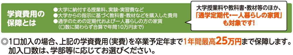 1口加入の場合、学資費用等を卒業予定年まで年間25万円(実費)を限度に保障します。