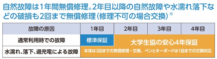 ※本体は4年間まで2回まで無償修理・交換対応(1年目の自然故障は無制限)、電源アダプタとSurfaceペン、タイプカバー(キーボード)は1回まで交換対応です。