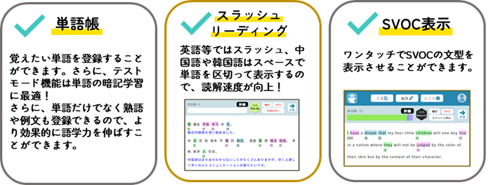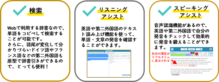DICTOOLは、パソコンやタブレット、スマホで利用できる辞書ツールで、単語を調べるだけでは無く、論文読解を補助する機能や、文章の発音や自分の発音を確認するアシスト機能など、英語学習を助ける様々な機能があります。