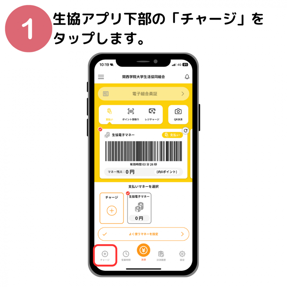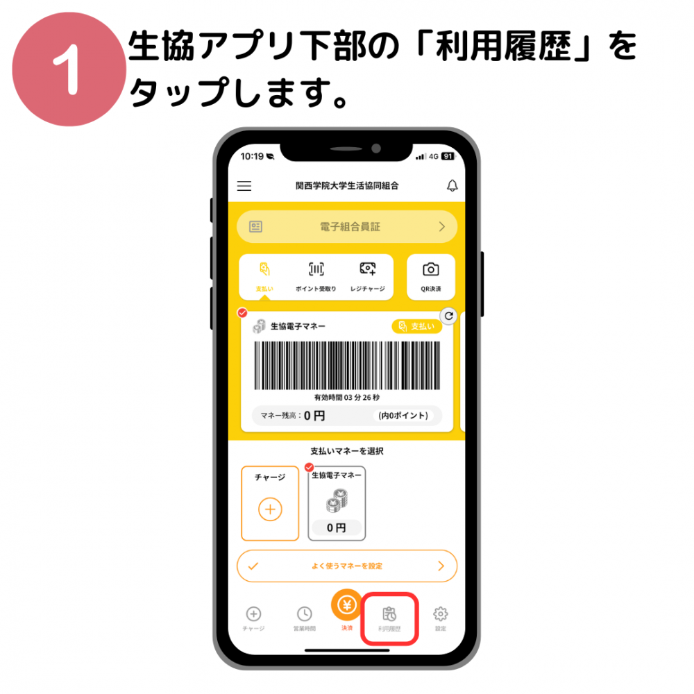 バーコード決済の画面が表示されれば、大学生協アプリの登録は完了です。