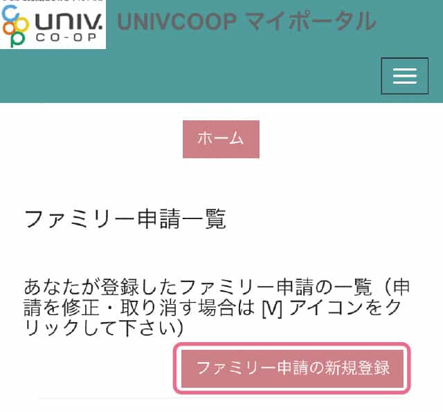 「ファミリー申請の新規登録」をタップし、登録画面に進みます。