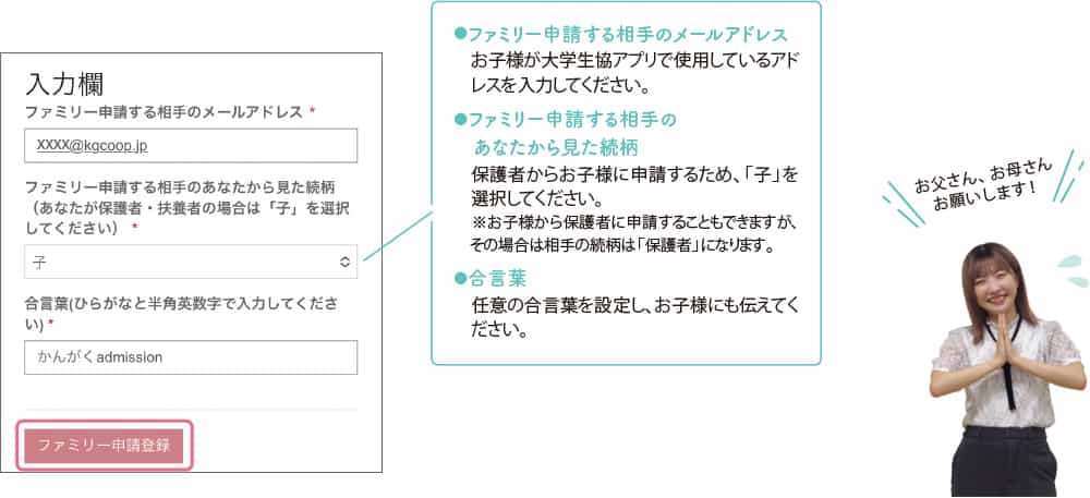 必要事項を入力し、「ファミリー申請登録」をタップします。
