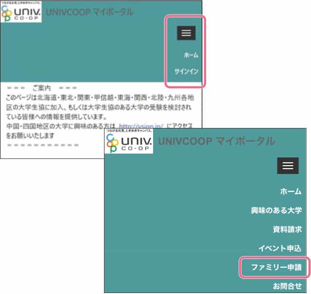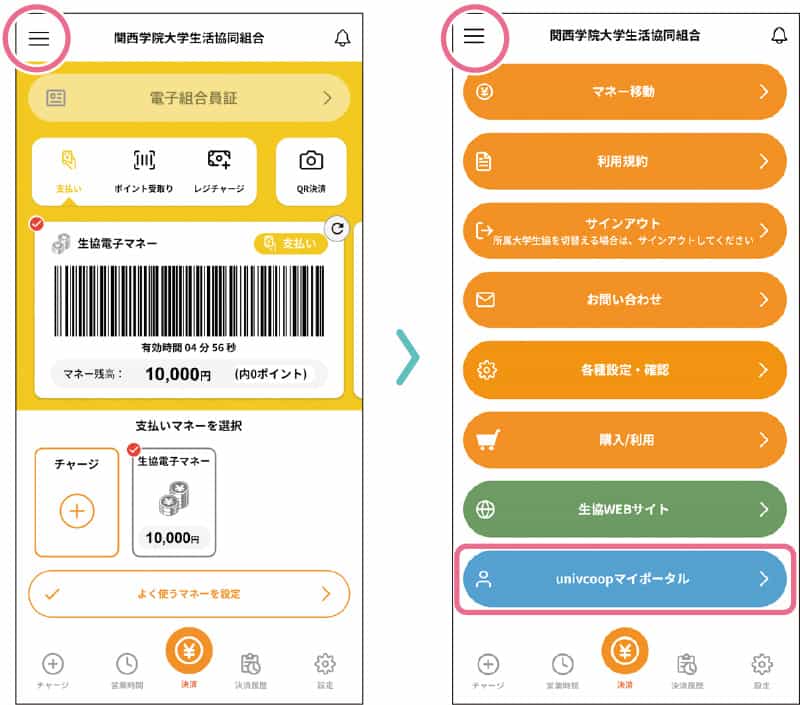 お子様の大学生協アプリ内の「univcoopマイポータル」をタップします。