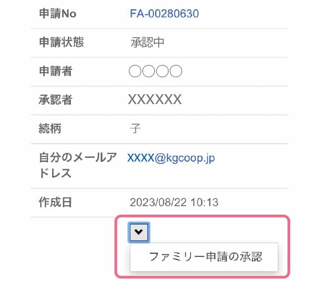 保護者からの申請内容が「あなたに送信されたファミリー申請一覧」に表示されます。