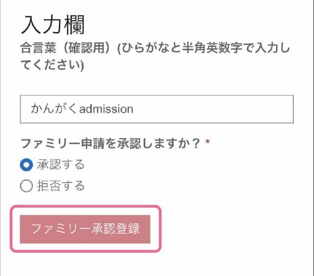 「合言葉」を入力し、「承認する」を選択の上、「ファミリー承認登録」をタップします。これでファミリー申請は完了です。