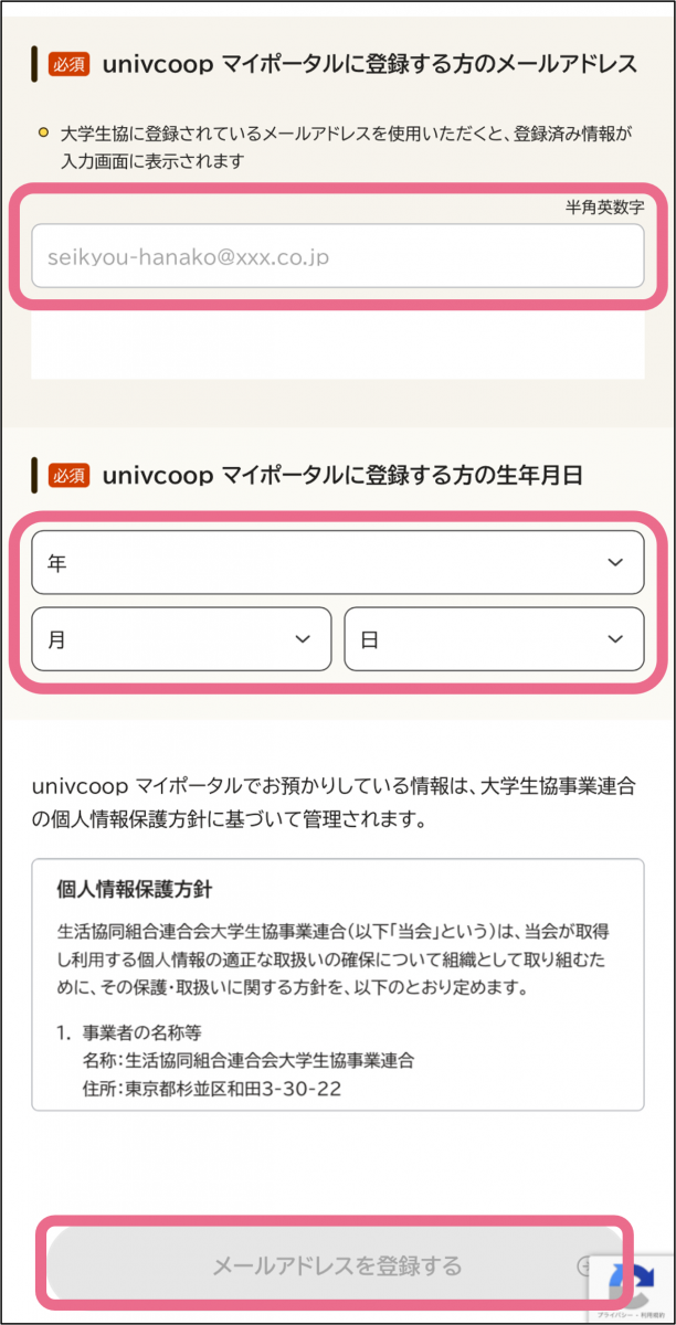 【注意】必ず生協に登録済のメールアドレスを入力してください。それ以外のメールアドレスを入力した場合、アプリの利用ができません。