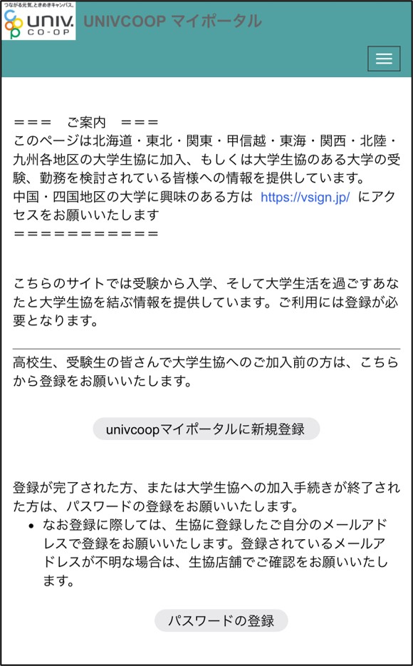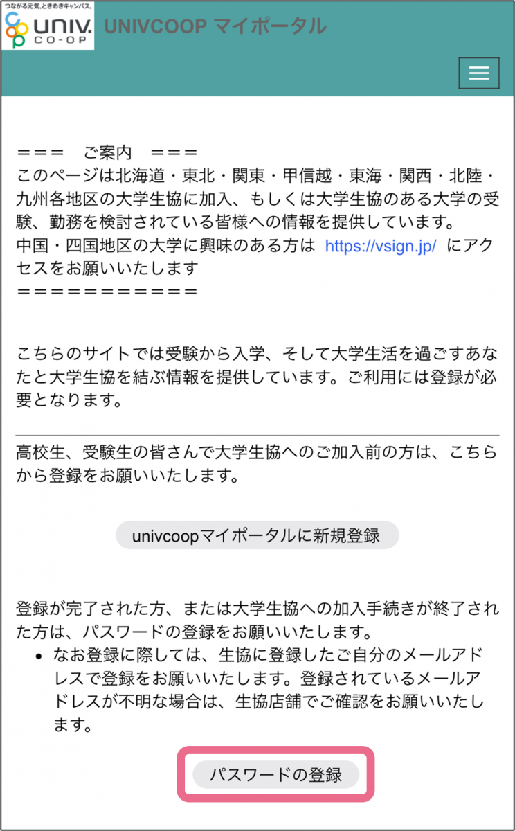 univcoopマイポータルにアクセスし、「パスワードの登録」をタップします。