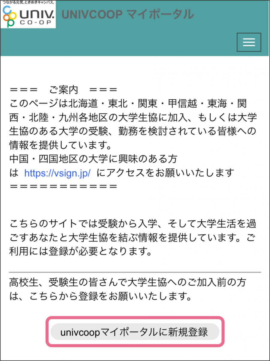 univcoopマイポータルにアクセスし、「univcoopマイポータルに新規登録」をタップします。