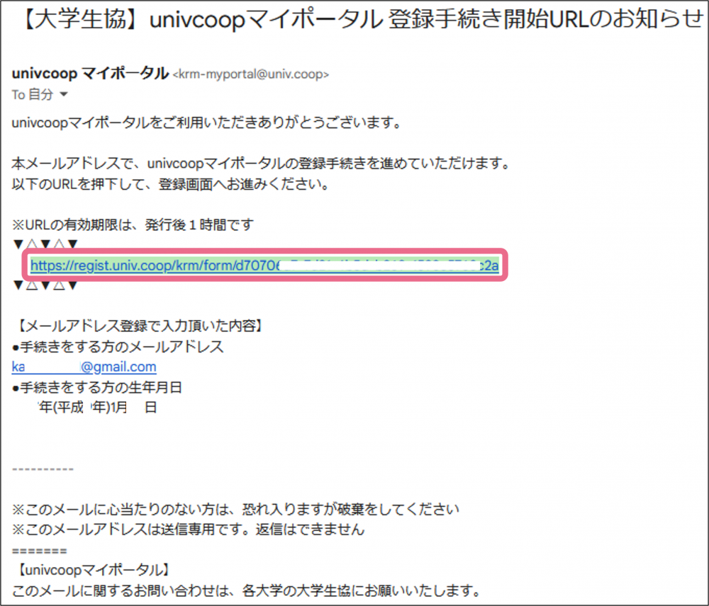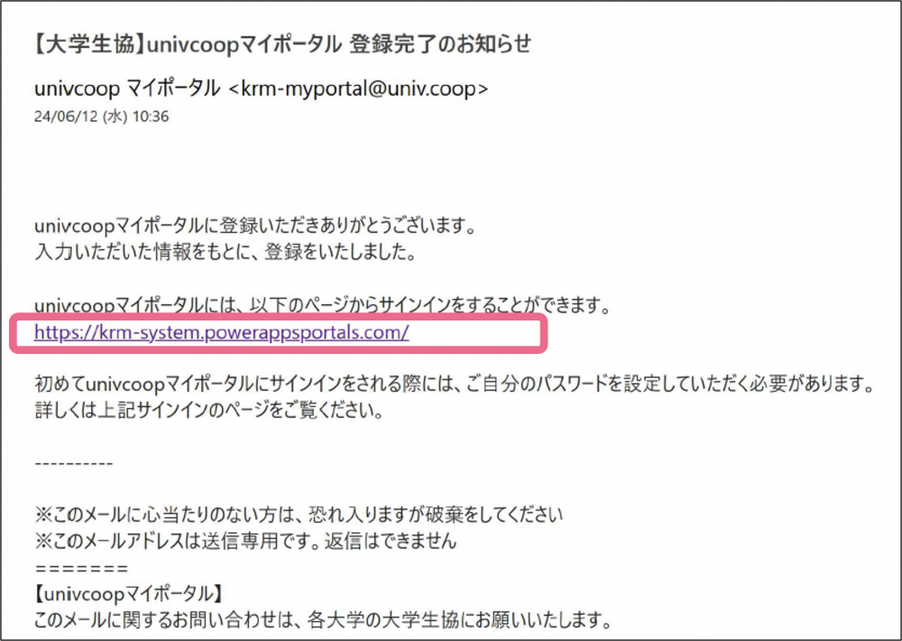 【注意】メールは「krm-myportal@univ.coop」から届きます。迷惑メール設定をされている場合は、迷惑メール除外設定をお願いします。