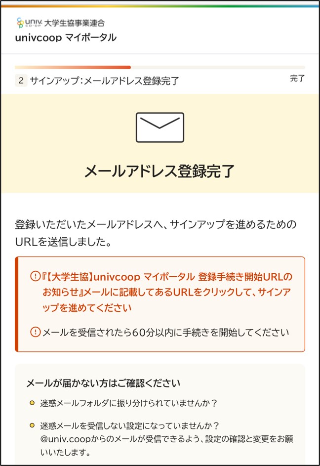 「メールアドレス登録完了」と表示されましたら、メールアドレスの設定は完了です。指定したメールアドレスに「【大学生協】univcoopマイポータル 登録手続き開始URLのお知らせ」という件名のメールが届きますので、メールの文面中に記載のURLをクリックしてください。