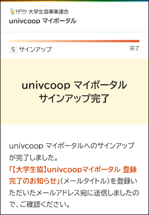 「univcoopマイポータル サインアップ完了」の画面が表示されましたら、サインアップの対応は完了です。「【大学生協】univcoopマイポータル 登録完了のお知らせ」という件名のメールも届きますので、合わせてご確認ください。