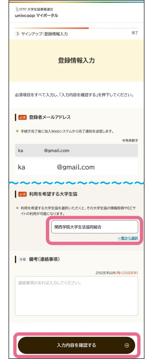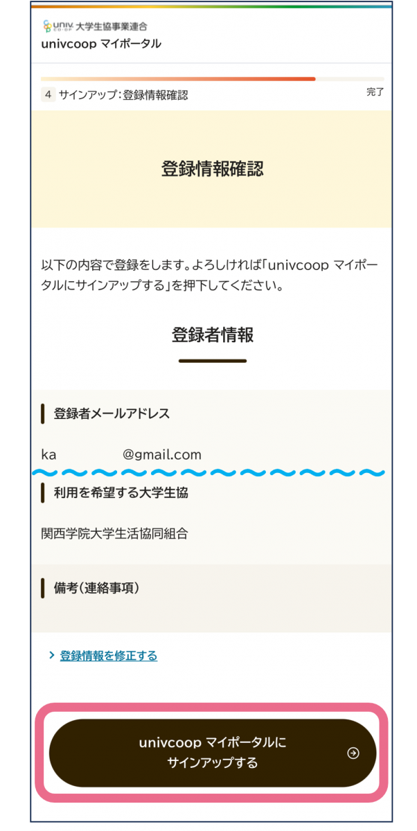 「登録情報確認」の画面が表示されますので、登録内容に間違いがないかご確認の上、「univcoopマイポータルにサインアップする」をタップしてください。