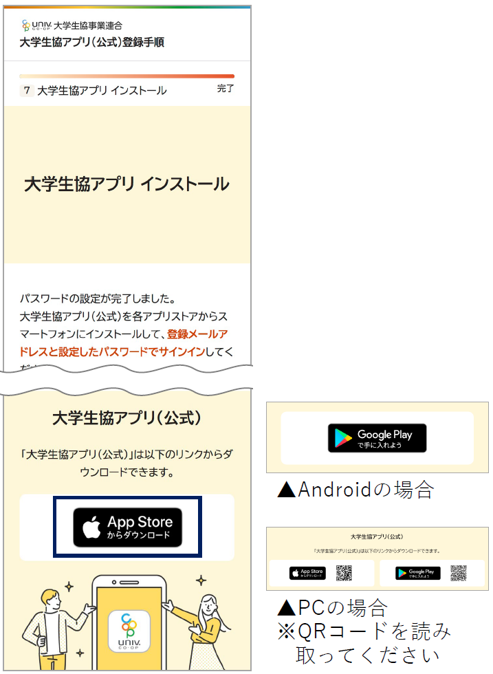 「大学生協アプリインストール」の画面が表示されましたらパスワードの設定は完了です。画面に表示されているアプリストアのボタンをタップして、大学生協アプリのダウンロードにお進みください。