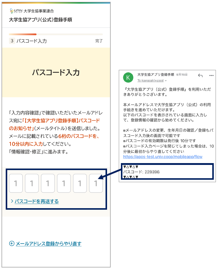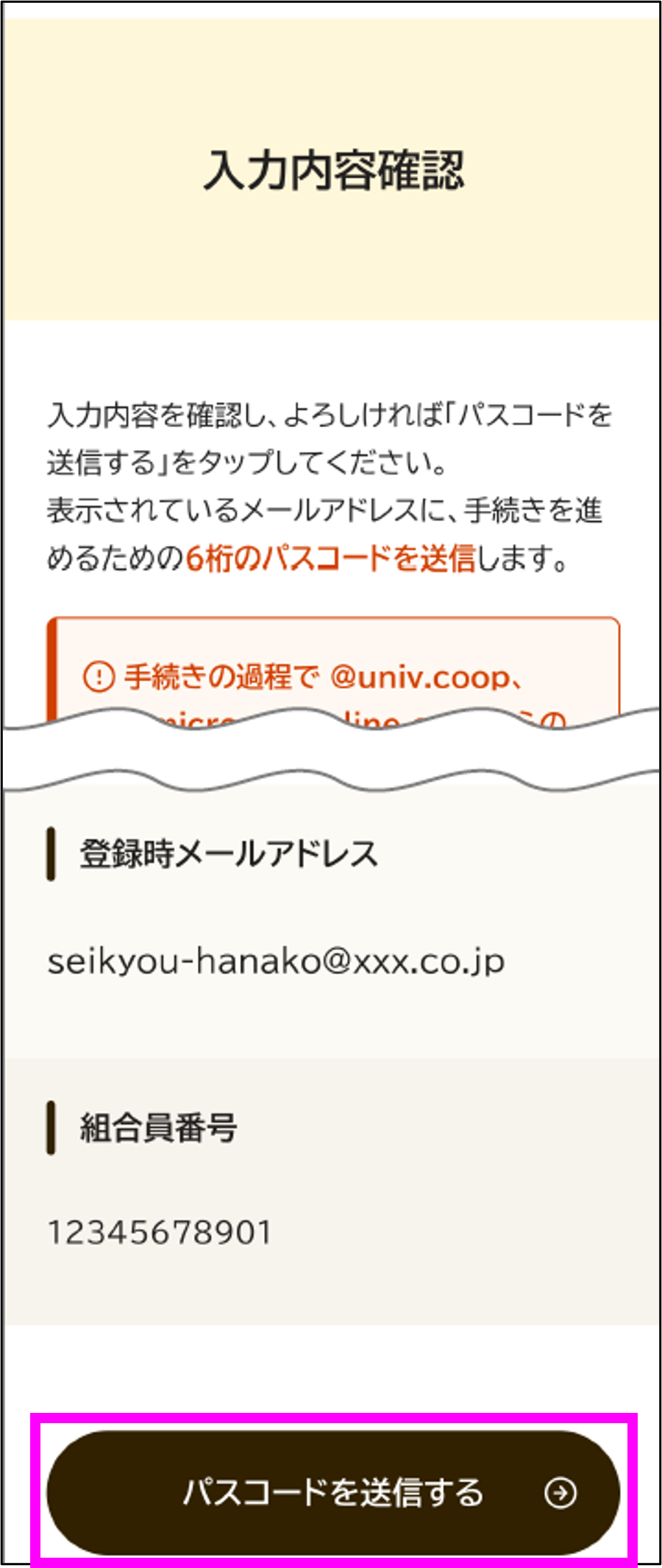 【注意】確認コードは、「 @univ.coop 」のドメインから届きます。迷惑メール設定をされている場合は、迷惑メール除外設定をお願いします。