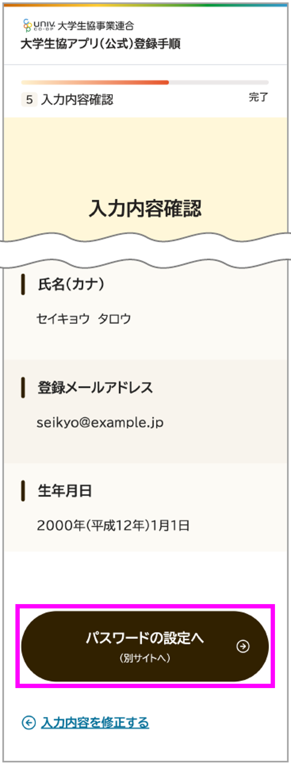 入力内容確認画面が表示されますので、内容を確認し、「パスワードの設定へ」をタップします。