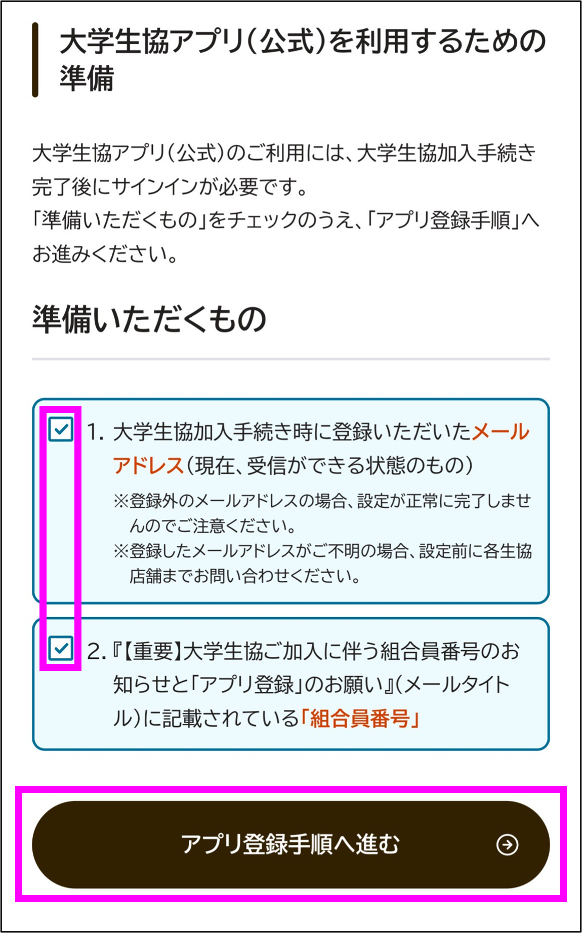 「準備いただくもの」の2つのチェックボックスにチェックを付け、「アプリ登録手順へ進む」をタップします。