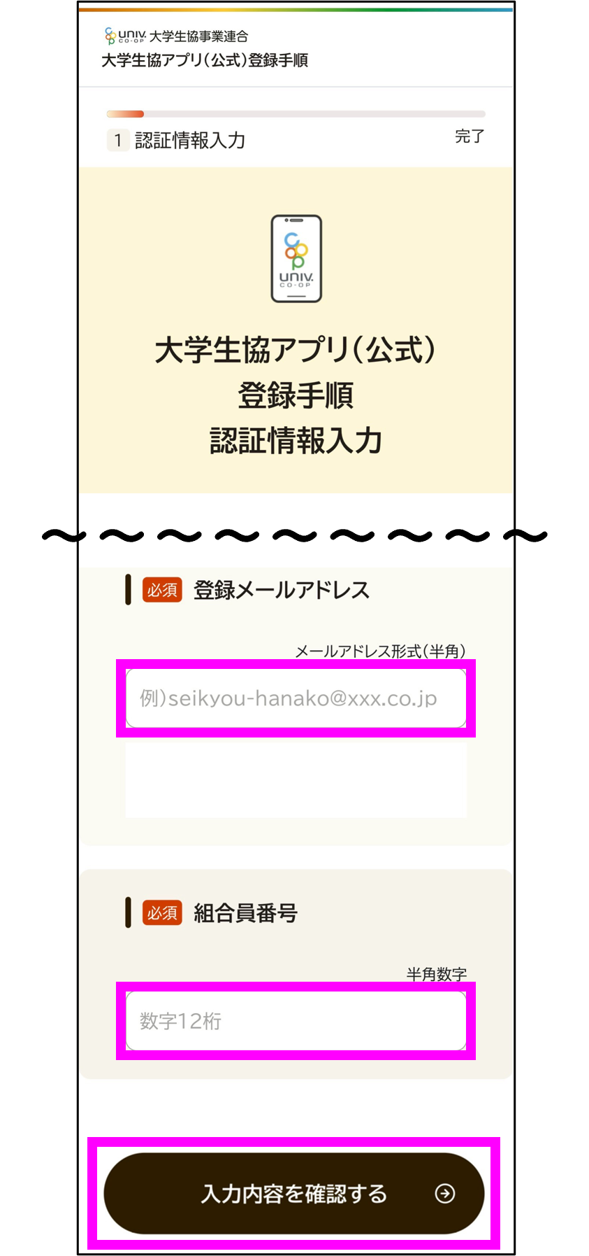 認証情報入力画面が表示されますので、「登録メールアドレス」欄にWeb組合員登録の際に入力した保護者のメールアドレスを、「組合員番号」欄にSTEP1で届いたメールに記載されているの保護者の家族組合員番号を入力し、「入力内容を確認する」をタップします。