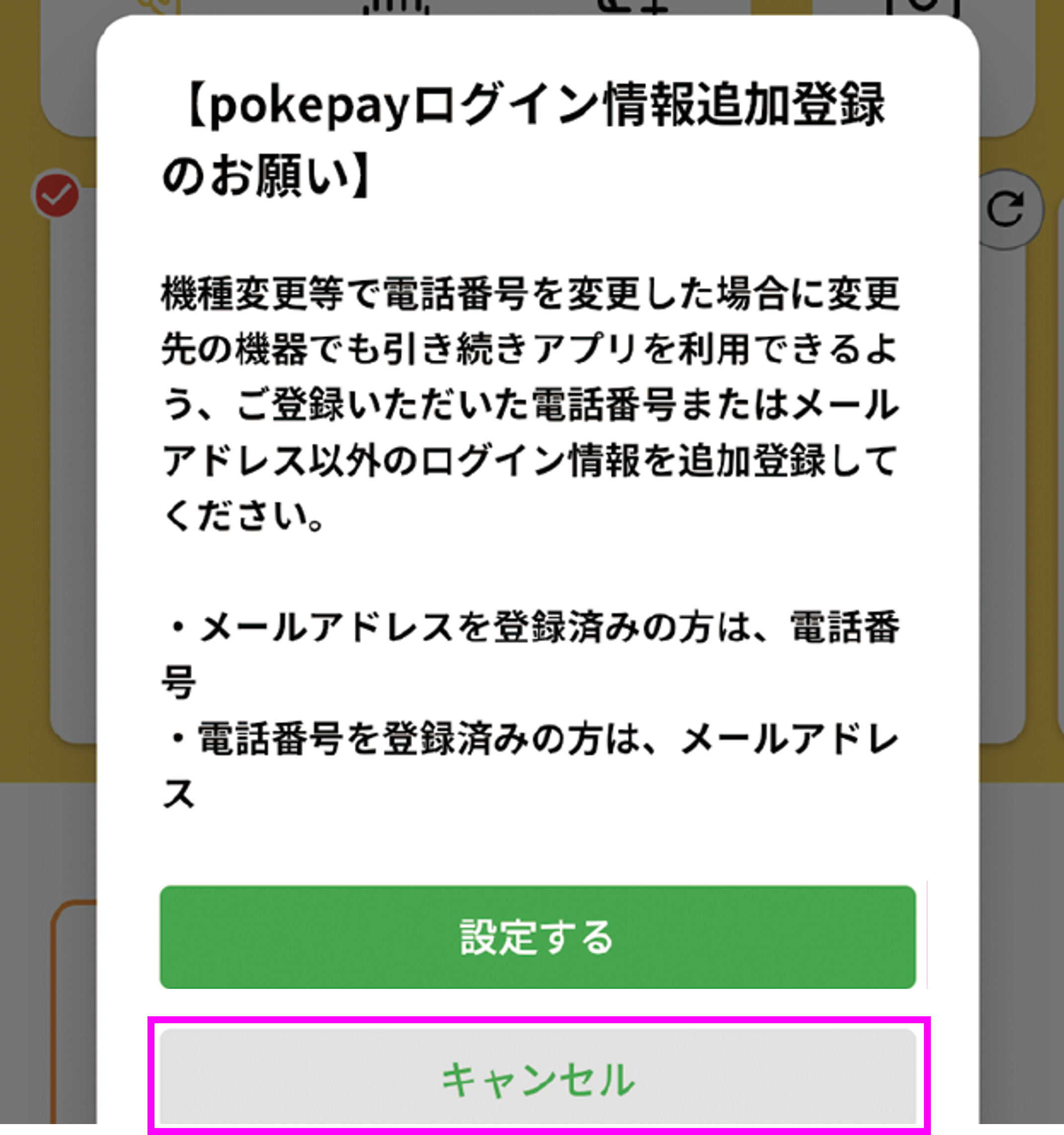 「pokepayログイン情報追加登録のお願い」というポップアップが表示されますが「キャンセル」をタップします。