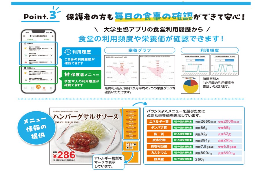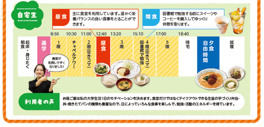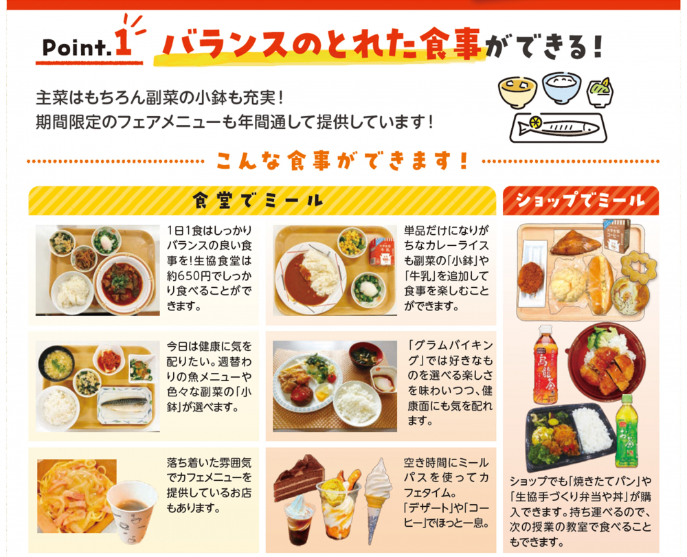 「下宿生活で自炊の負担が減り、生協の丼やパンを楽しんでいます。キャッシュレスで会計もスムーズです。」