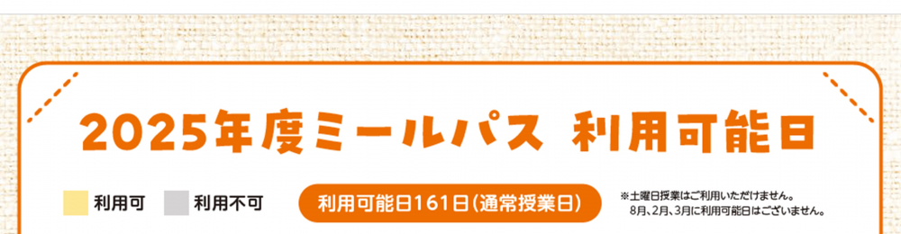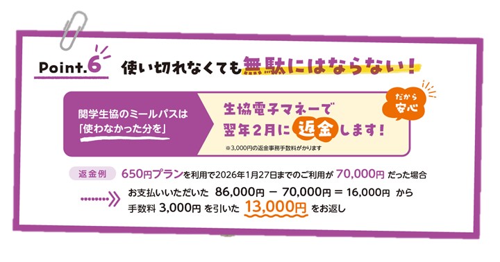 - A. 年間利用合計がミールパスの購入金額に満たない場合、差額を翌年2月に生協電子マネーで返金します(事務手数料3,000円)。