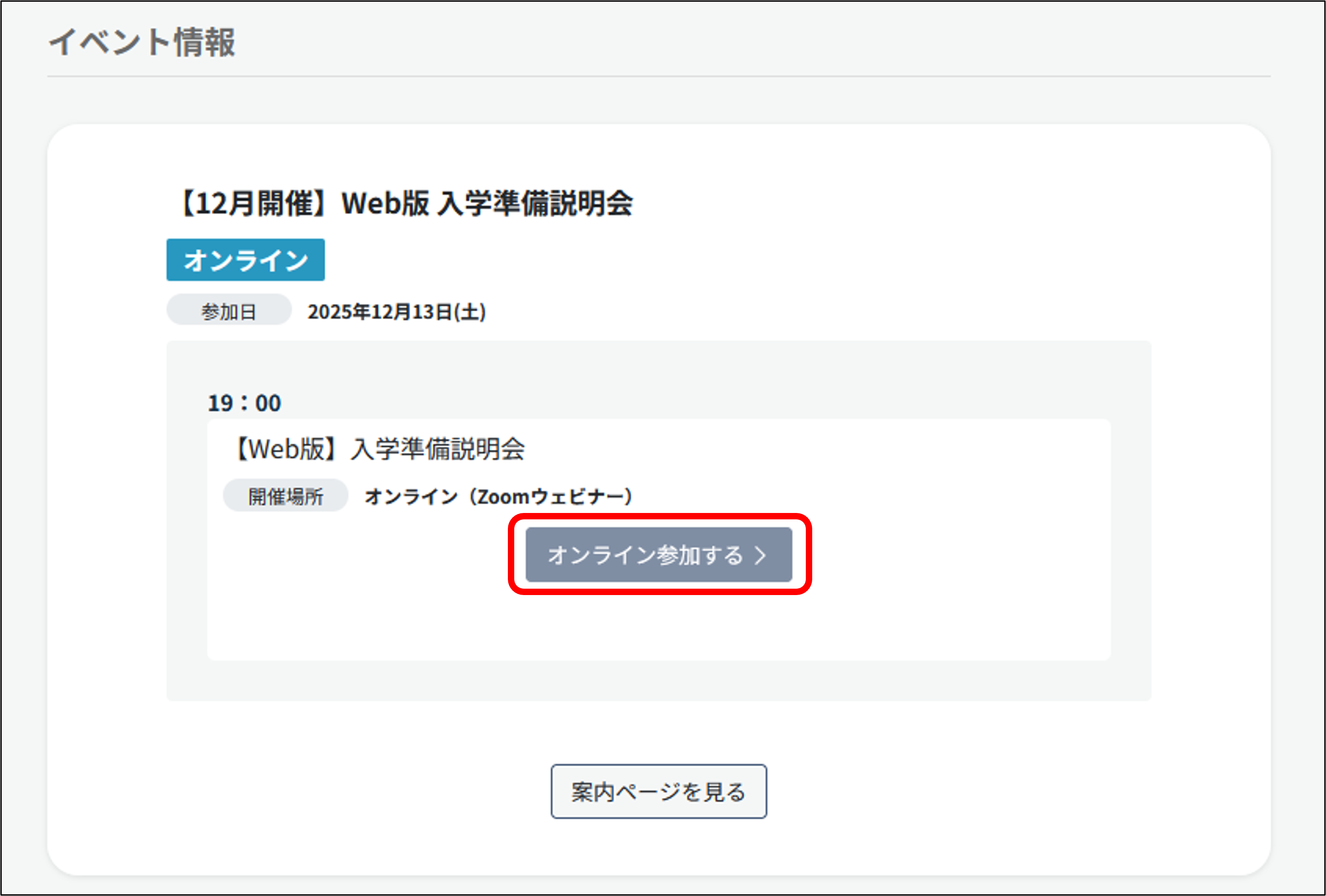 該当のイベントが表示されますので、「オンライン参加する」をクリックします。