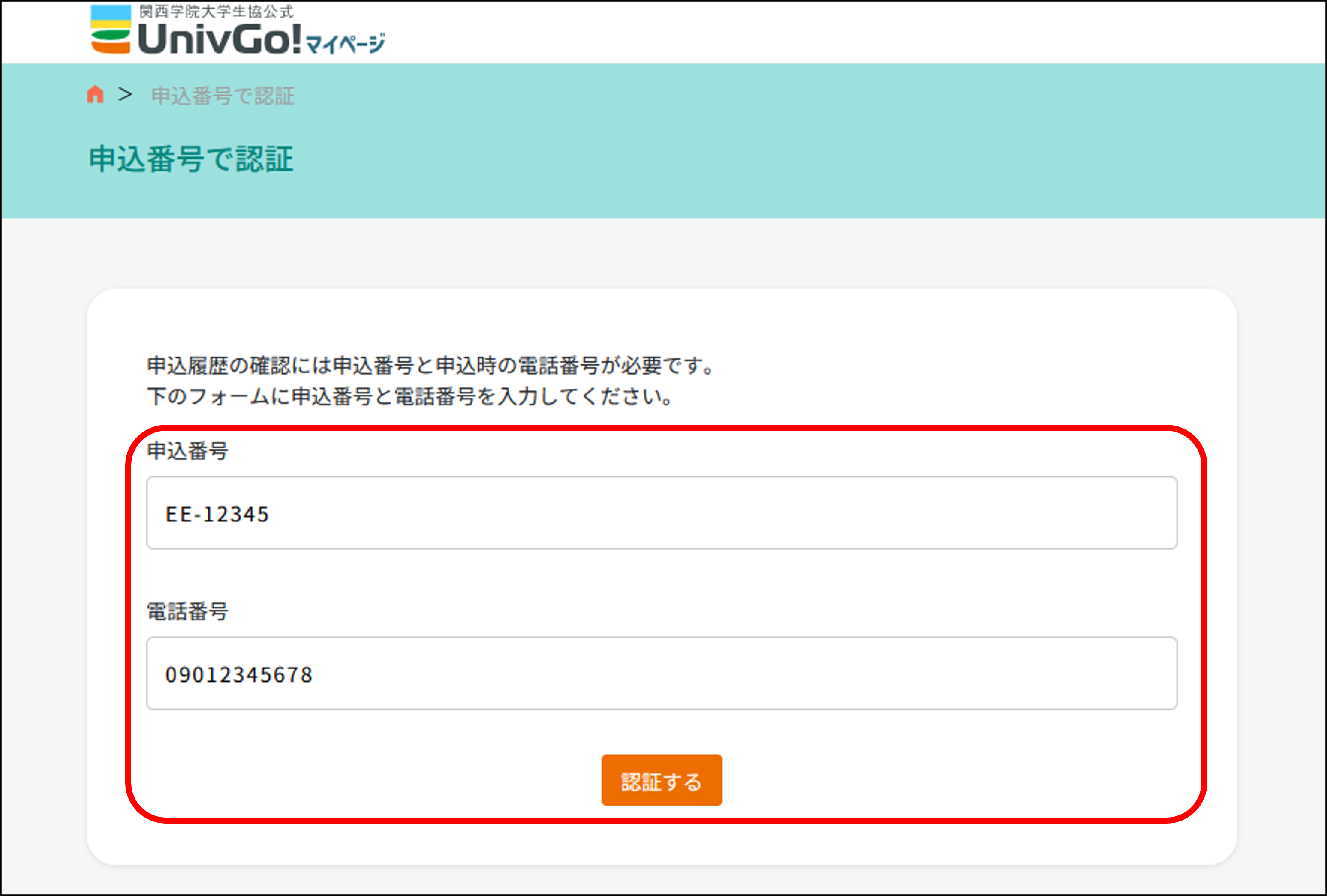 お申し込み完了時に届くメールに記載の「EE-○○○○○」申込番号と、お申し込みの際の電話番号を入力し、「認証する」をクリックします。
