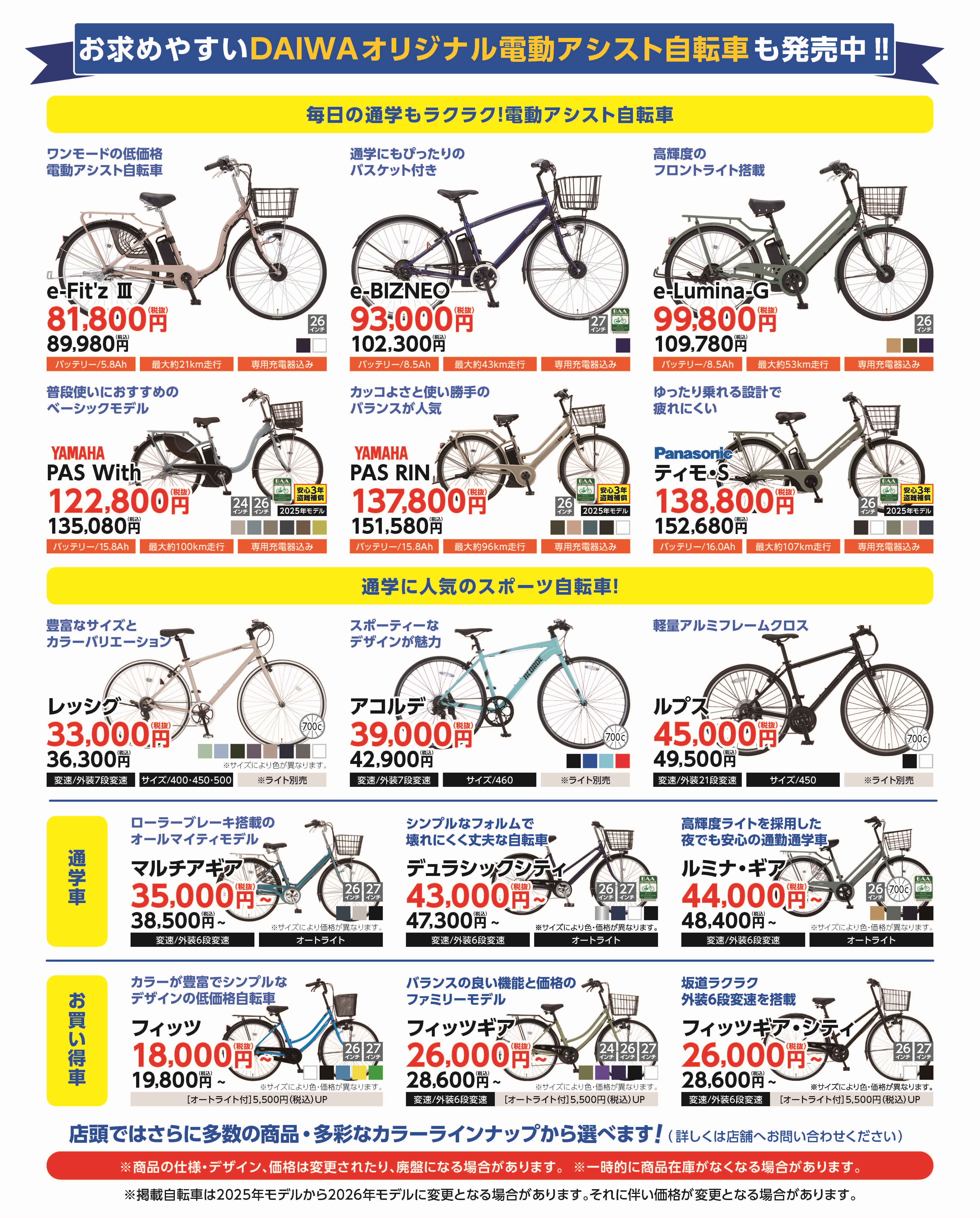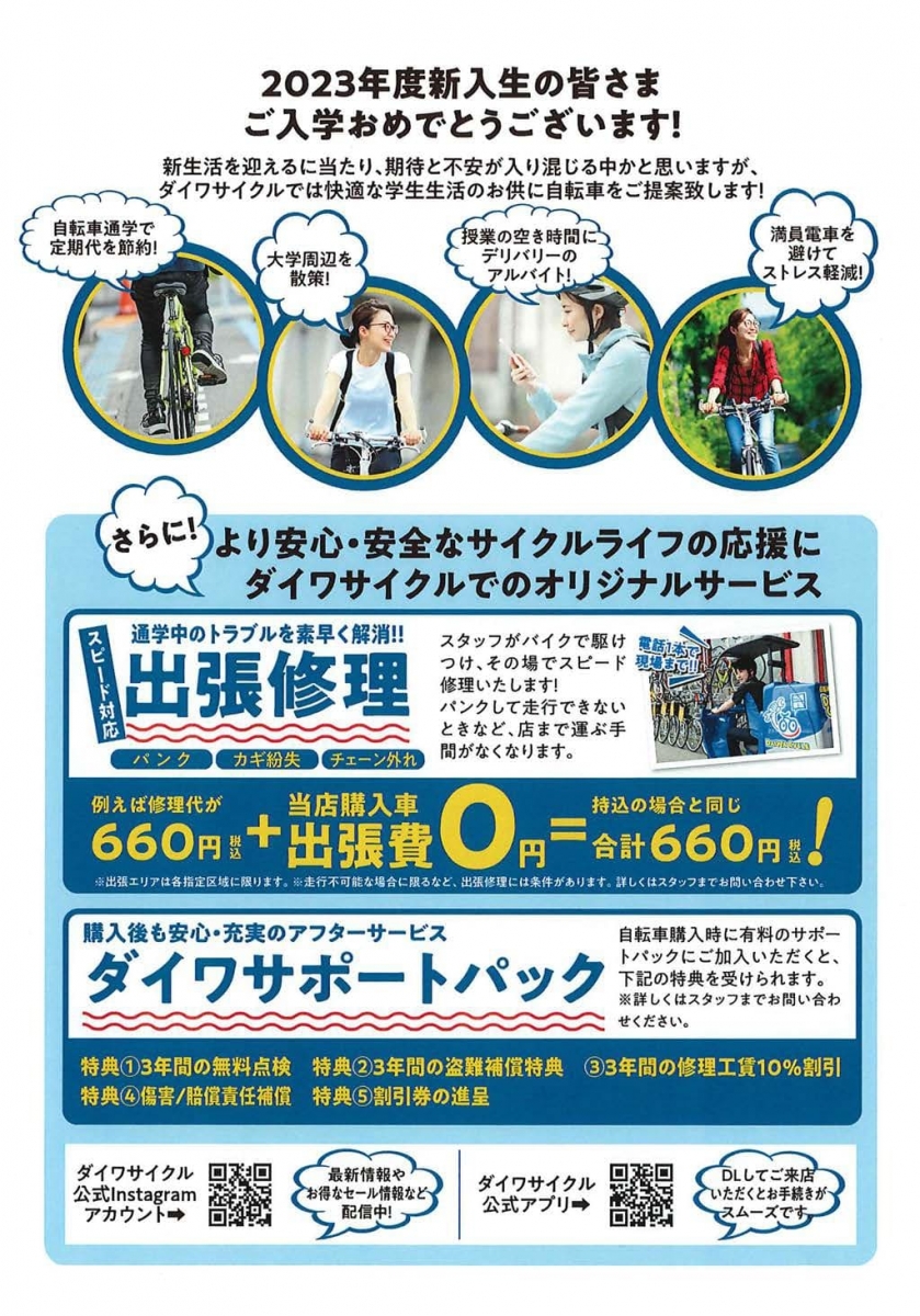 ダイワサイクルで自転車を購入すると、出張修理の出張代金が無料!(修理代は別途費用がかかります)