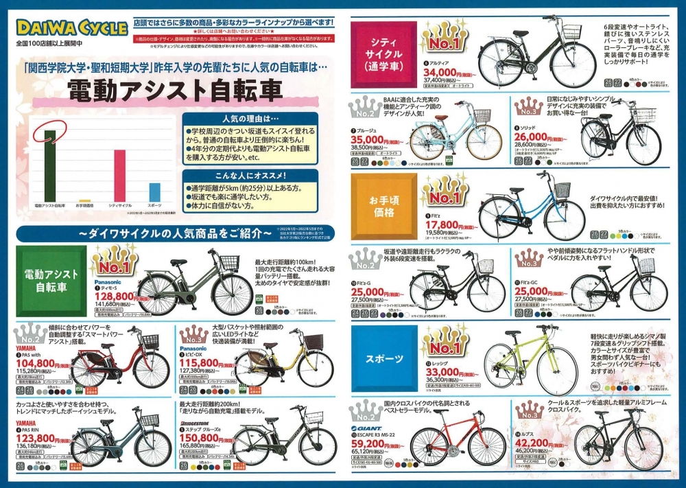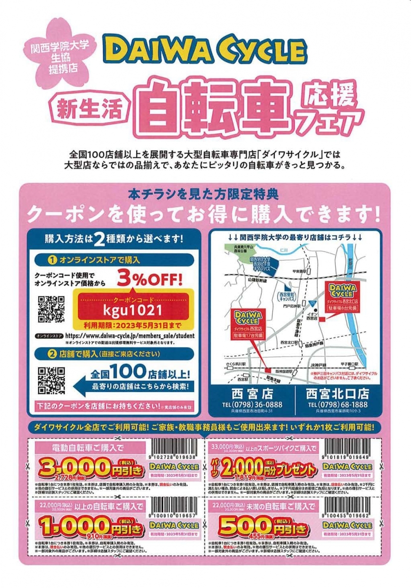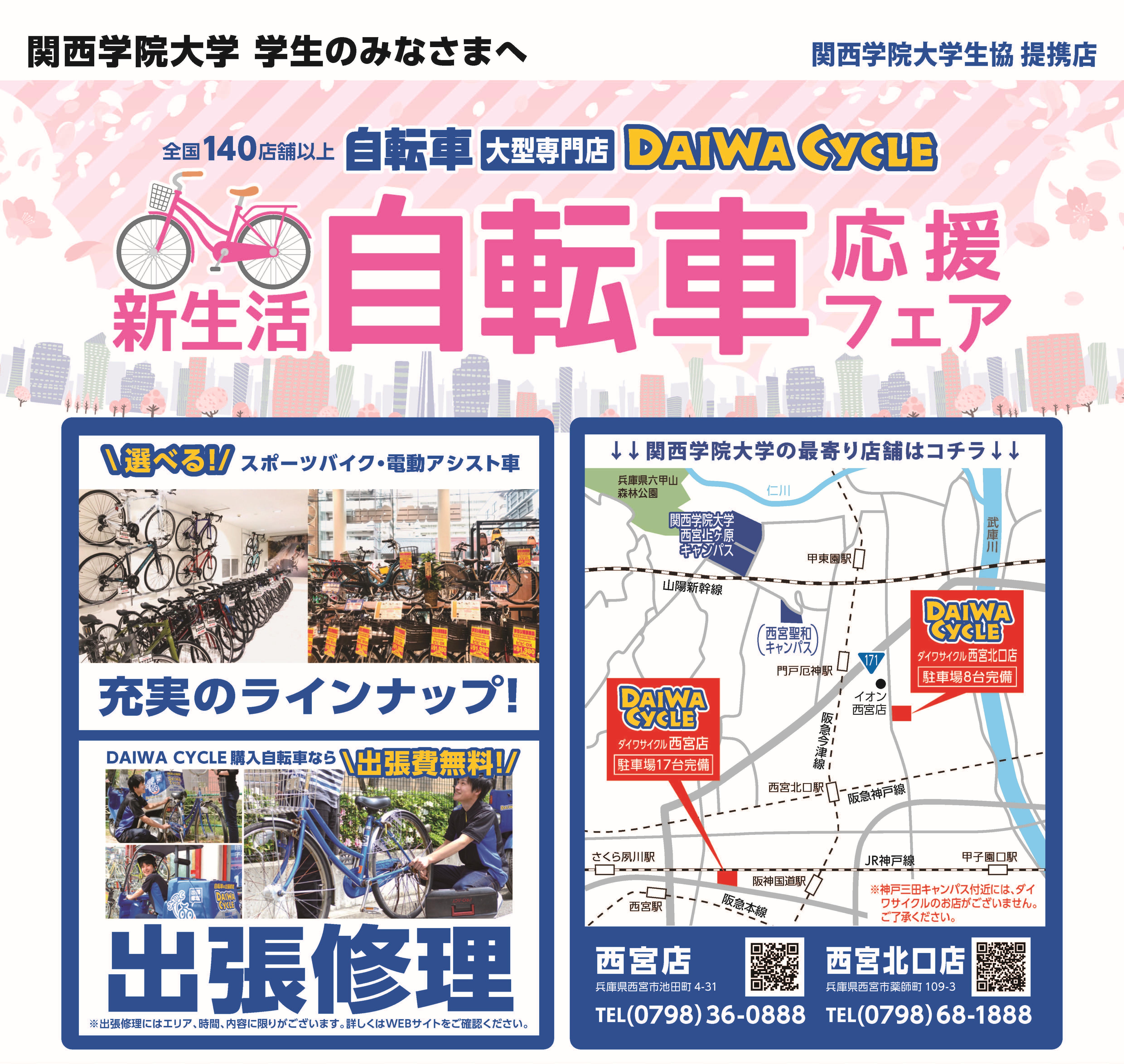 西宮上ケ原キャンパス・西宮聖和キャンパスに近いダイワサイクル実店舗