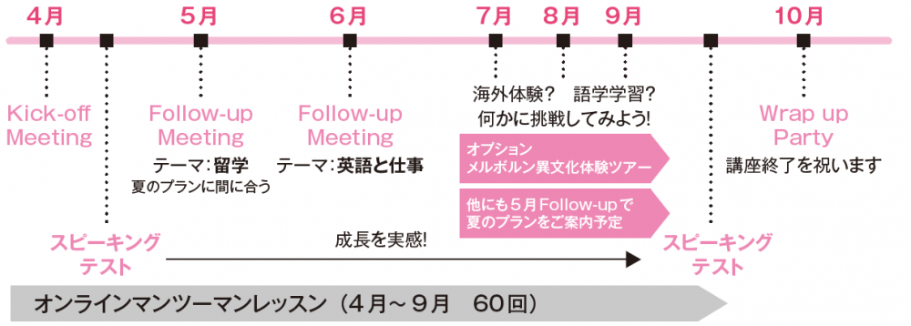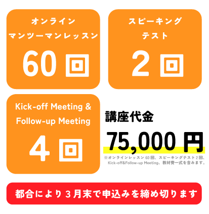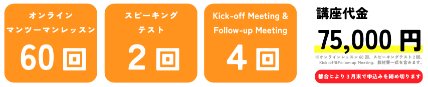 ※オンラインレッスン60回、スピーキングテスト2回、Kick-off & Follow-up Meeting、教材費一式を含みます。
