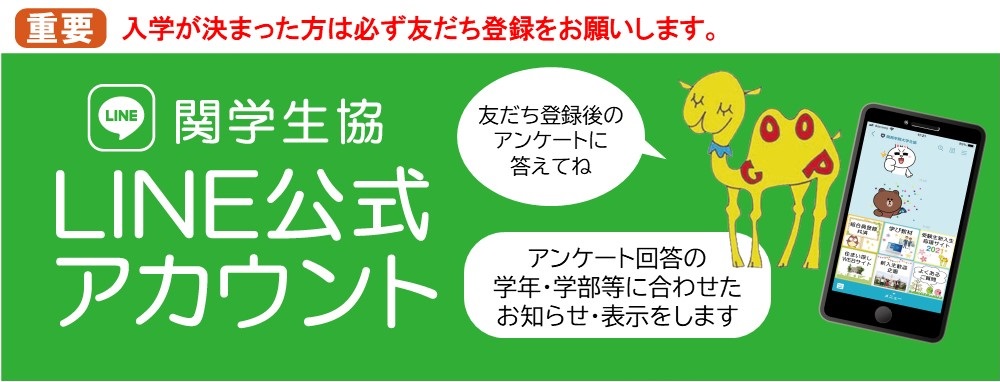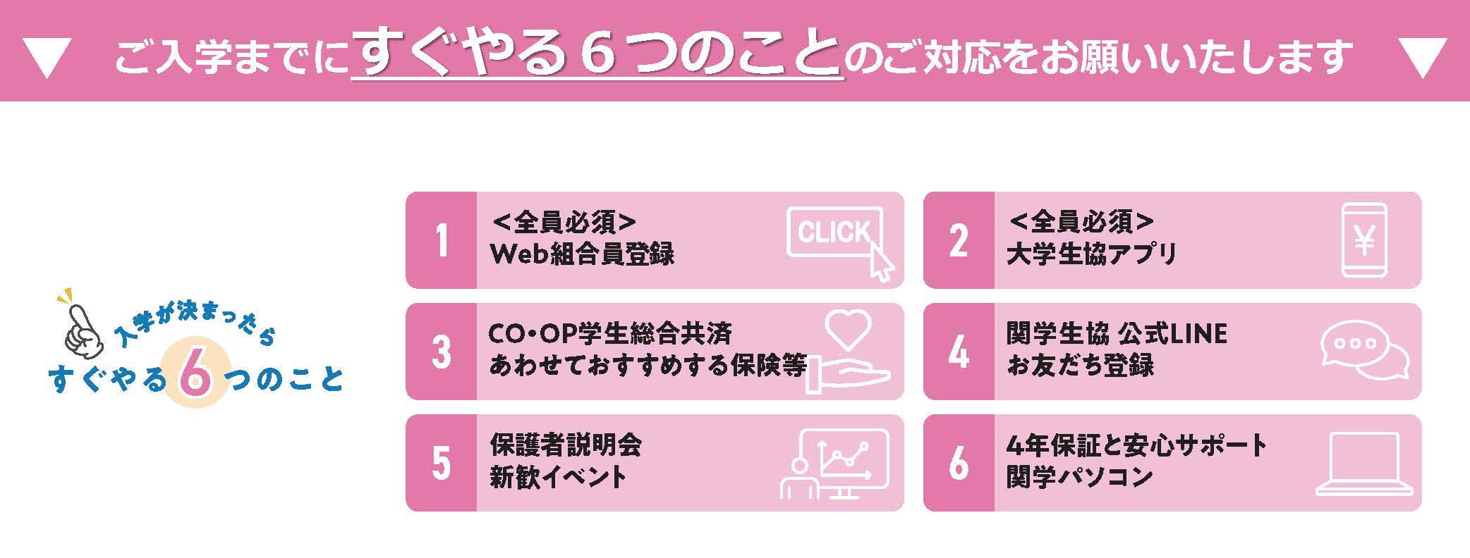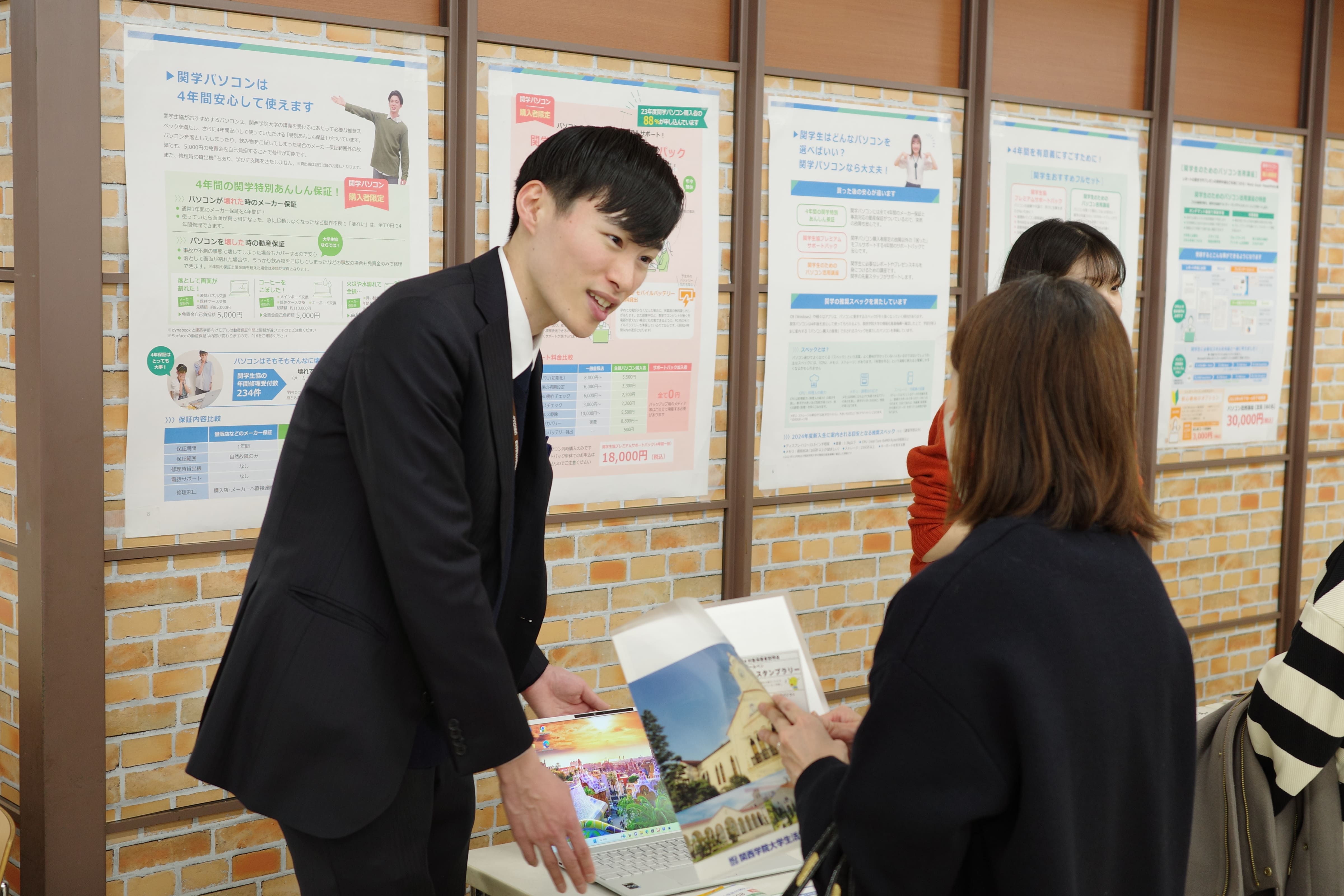 関学生協では、関西学院大学・関西学院短期大学へ入学が決まった方に向けて、「親子で参加する”入学準備説明会”」の開催や、関学生におすすめの「パソコン」「講座」「食事の年間定期券”ミールパス”」「保障制度」などを通して大学生活のサポートを行っています。