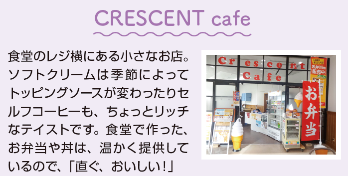 食堂のレジ横にある小さなお店。ソフトクリームは季節によってトッピングソースが変わったりセルフコーヒーも、ちょっとリッチなテイストです。食堂で作った、お弁当や丼は、温かく提供しているので、「直ぐ、おいしい!」