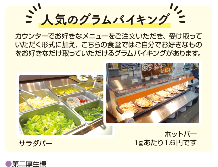 カウンターでお好きなメニューをご注文いただき、受け取っていただく形式に加え、こちらの食堂ではご自分でお好きなものをお好きなだけ取っていただけるグラムバイキングがあります。