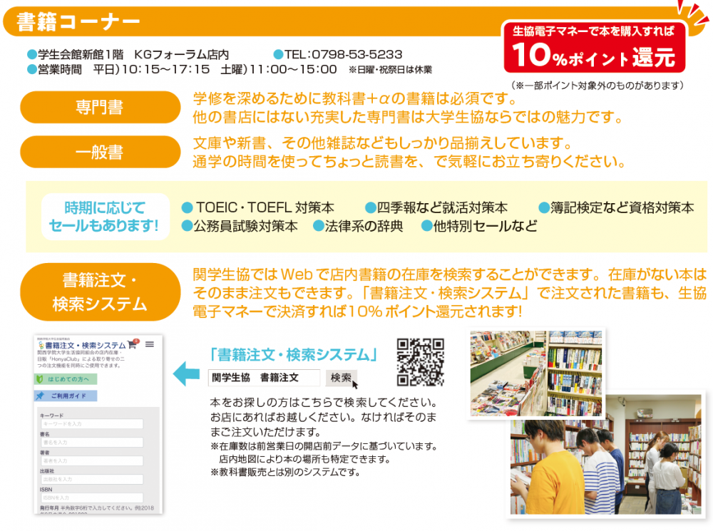 一般書・文庫・雑誌を購入できます。教科書と同様に、 10 %ポイント還元があります。書籍のご注文も承っております。