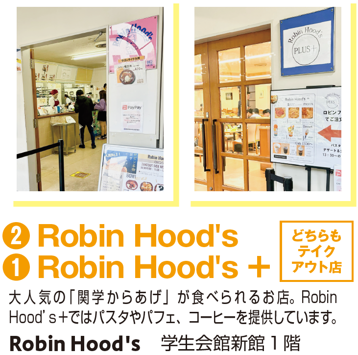大人気の「関学からあげ」が食べられるお店。Robin Hood’s PLUS+ではパスタやパフェ、コーヒーを提供しています。