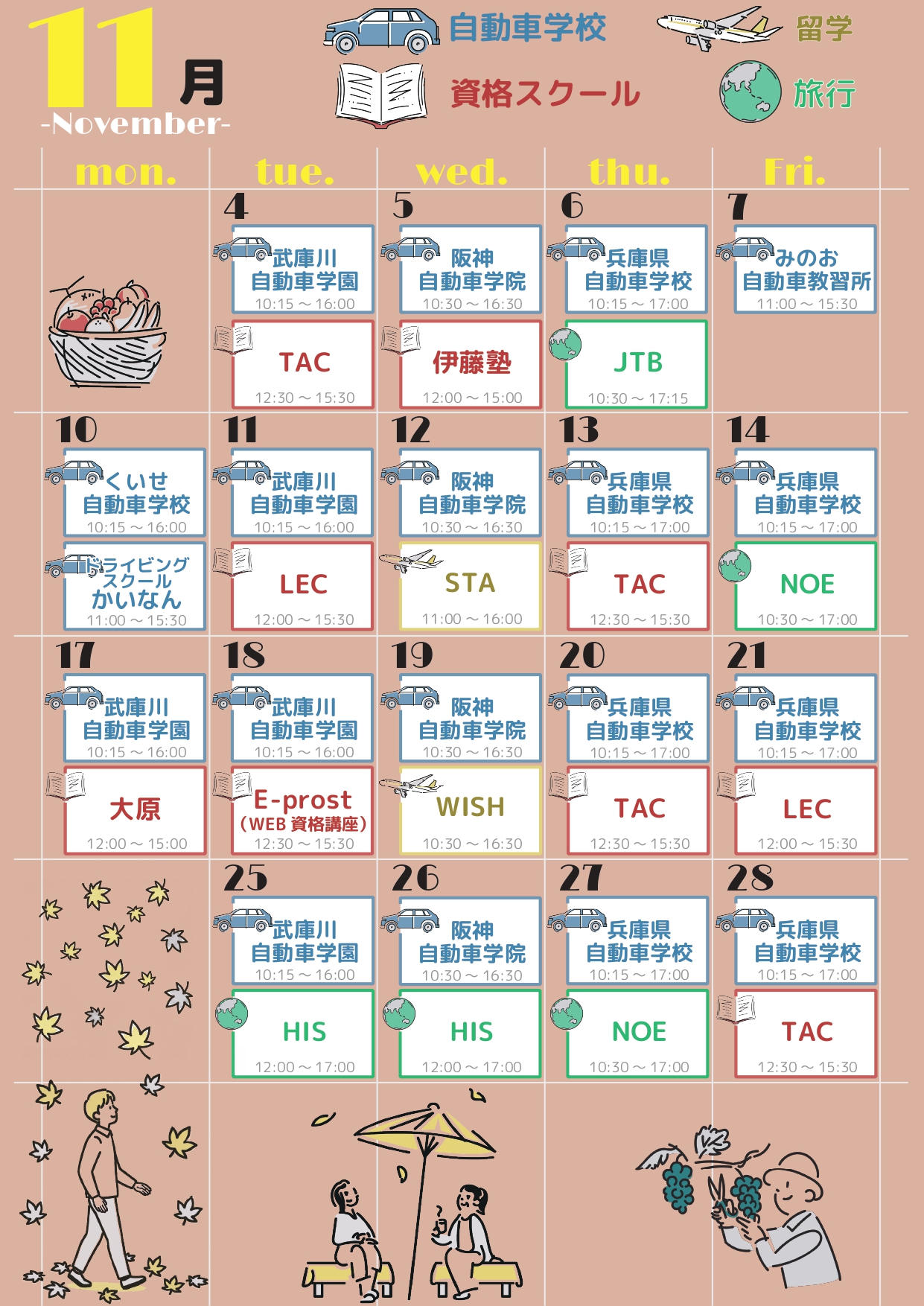 自動車学校は長期休暇中も含めて原則毎日、資格スクール・語学留学は授業シーズンに、日替わりで相談会を開催しています。参加無料・予約不要なので、どなたでもお気軽にご参加ください!