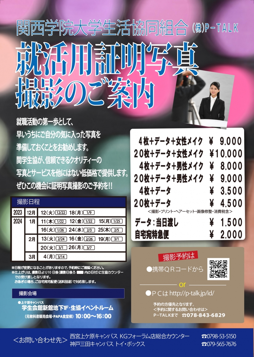 ※神戸三田キャンパス、西宮聖和キャンパスでの撮影はございません。 - 撮影時間:10:00~16:00