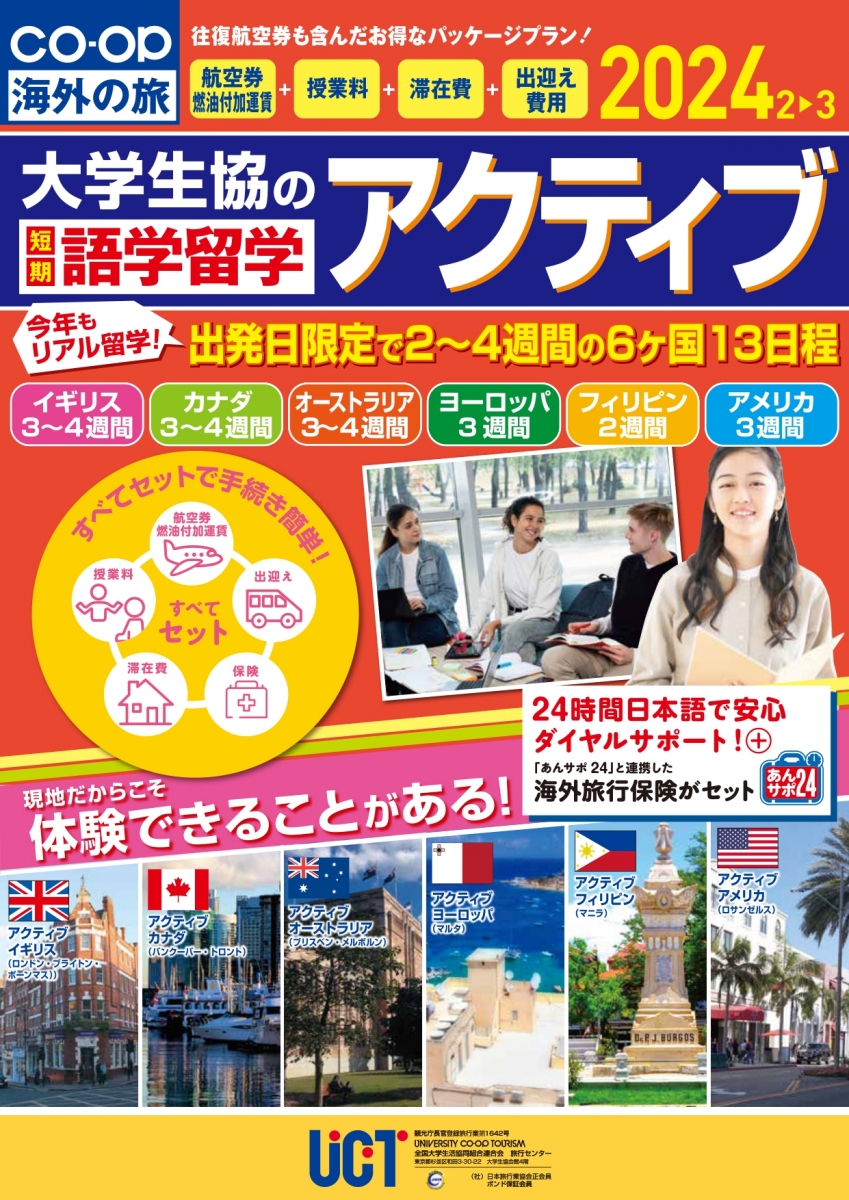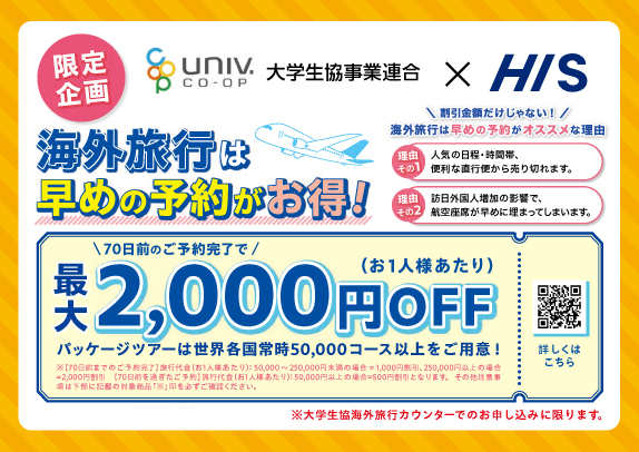 JTB、日本旅行など各旅行会社のパンフレットをご用意しています。大学生協「旅行Web直」でお得に予約OK
