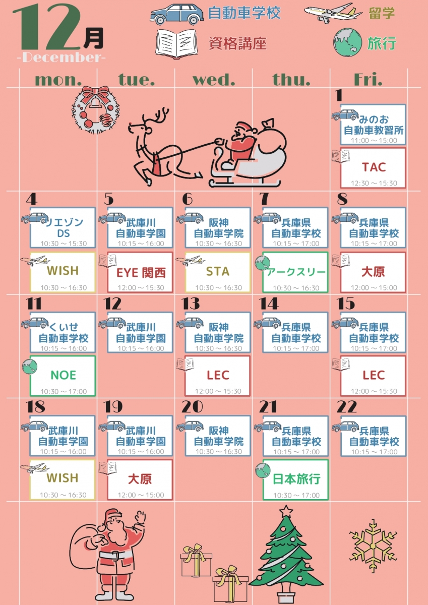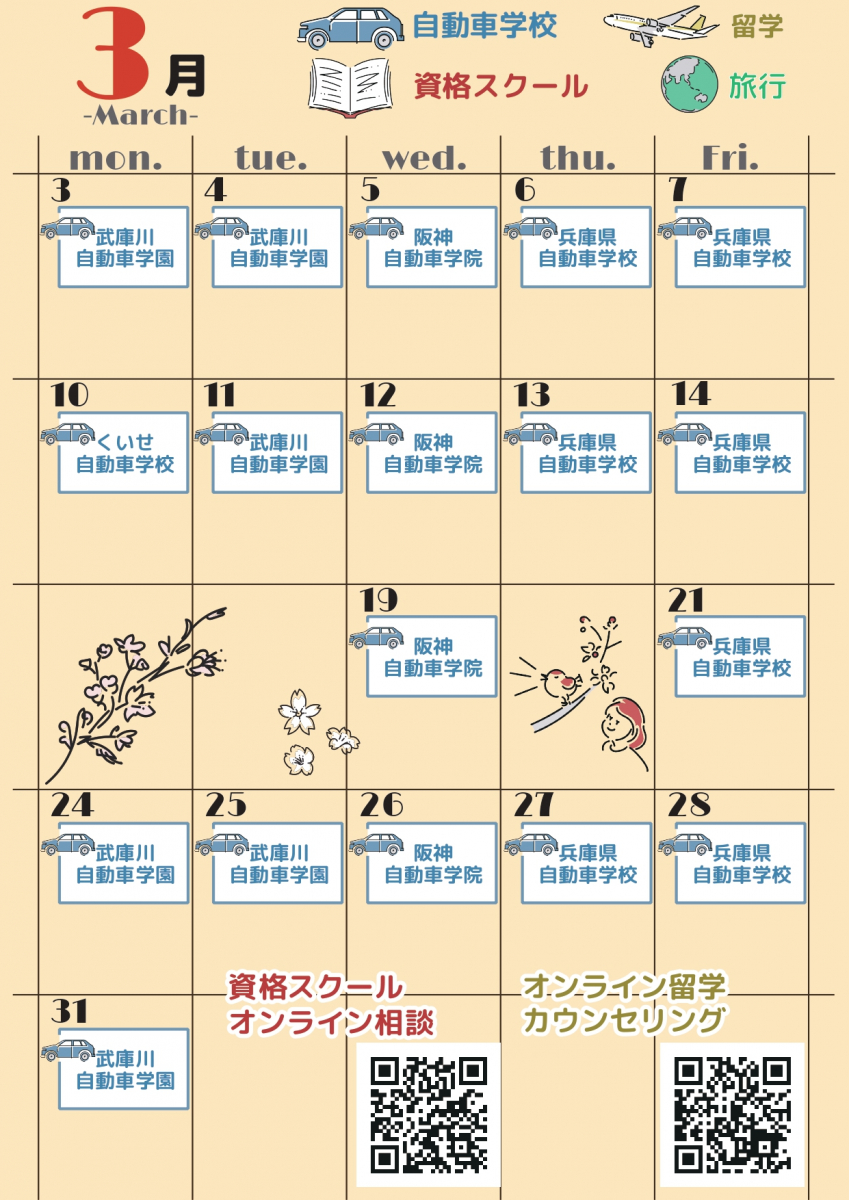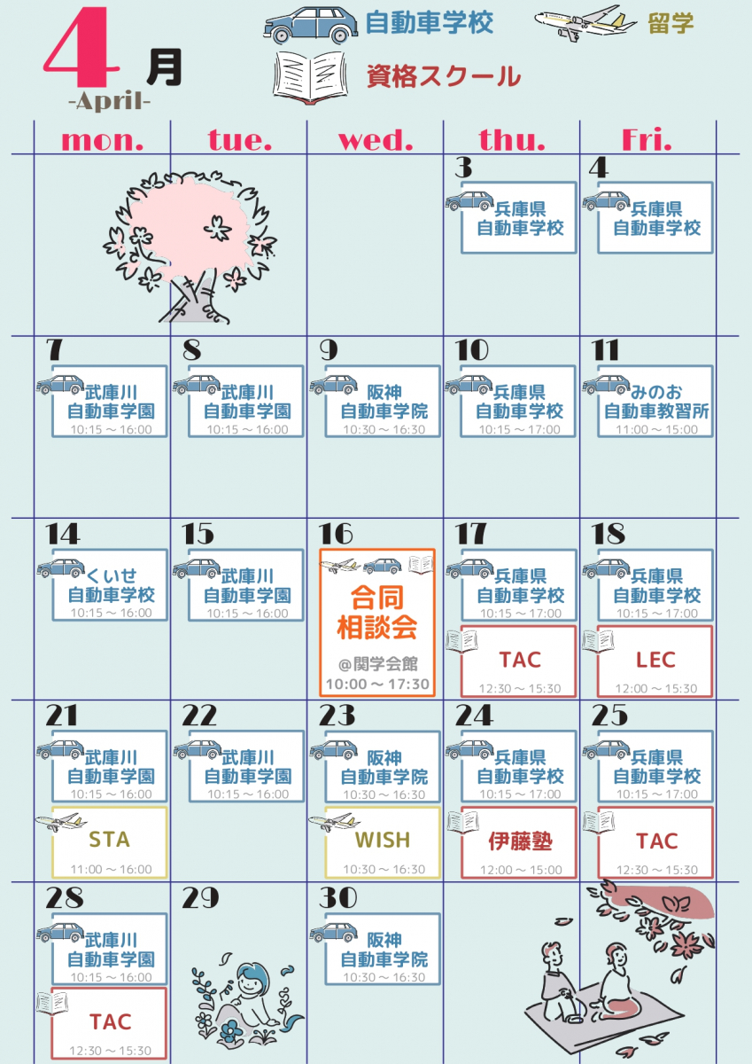 自動車学校は長期休暇中も含めて原則毎日、資格スクール・語学留学は授業シーズンに、日替わりで相談会を開催しています。参加無料・予約不要なので、どなたでもお気軽にご参加ください!